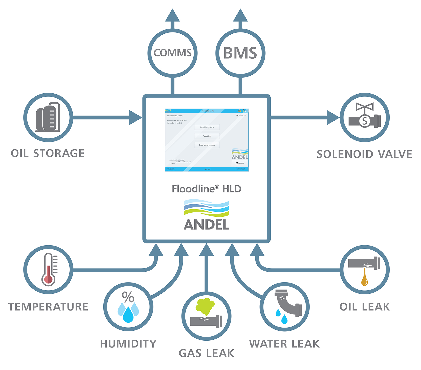 The hybrid Floodline® HLD multifunction control panel provides complete BMS connectivity via Modbus and onward communication capabilities include Modbus, Ethernet, email and SMS.