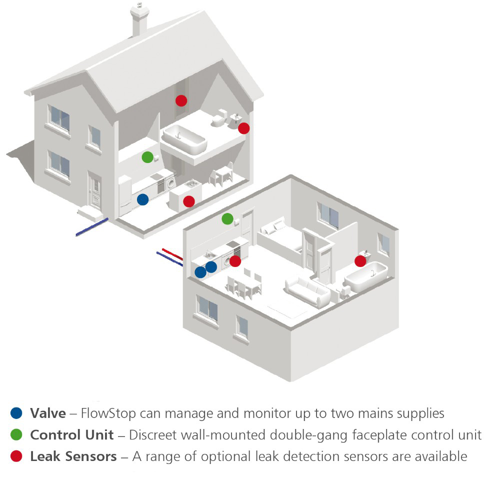 FlowStop® is ideal for residential properties and because it can monitor and manage up to two water supplies it is also the perfect solution for those properties with seperate hot and cold water supplies such as residential apartments, student accommodation, hotel rooms, offices and commercial units.